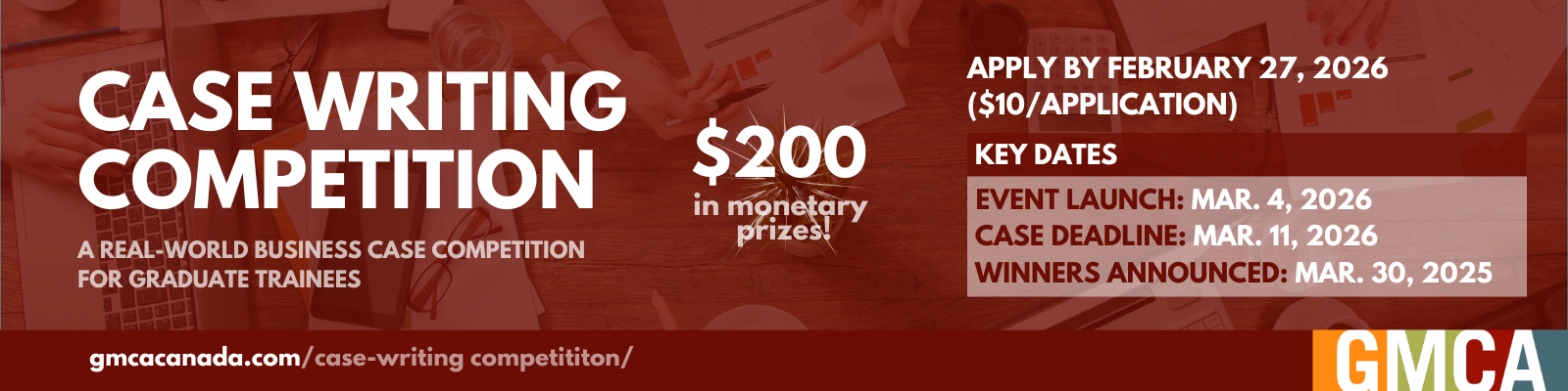 The case instructions will be released on March 4, 2026 (12:01 AM ET). Teams must submit their final written case by Wednesday, March 11, 2026 (11:59 PM ET). All submissions will first be reviewed by the GMCA executive team, after which the top three cases will be determined by external judges. Winners will be announced on March 30, 2026.